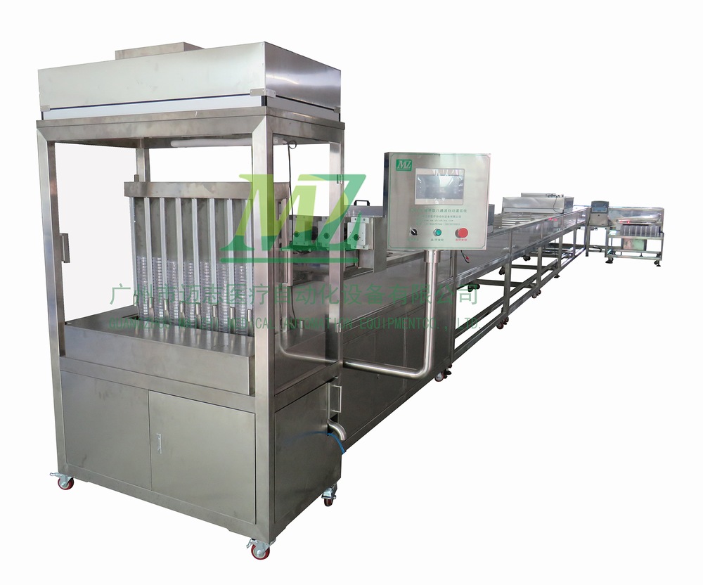 真空采血管生產設備自動化流水線性能說明 (1) 真空采血管生產結合國內實際生產需求,設計生產的真空采血管自動裝管,促凝劑加藥噴霧、烘干、蓋帽、抽真空壓帽、取管、裝托盤的全自動化機械設備; (2) 該機全部采用可編程控制,氣動執(zhí)行機構。根據真空采血管的生產特點,通過程序軟件將所有的機械執(zhí)行動作有機組合控制; (3) 該機配備自動熱收縮包裝機,可實現包裝自動化,達到全自動化組合生產的目的;